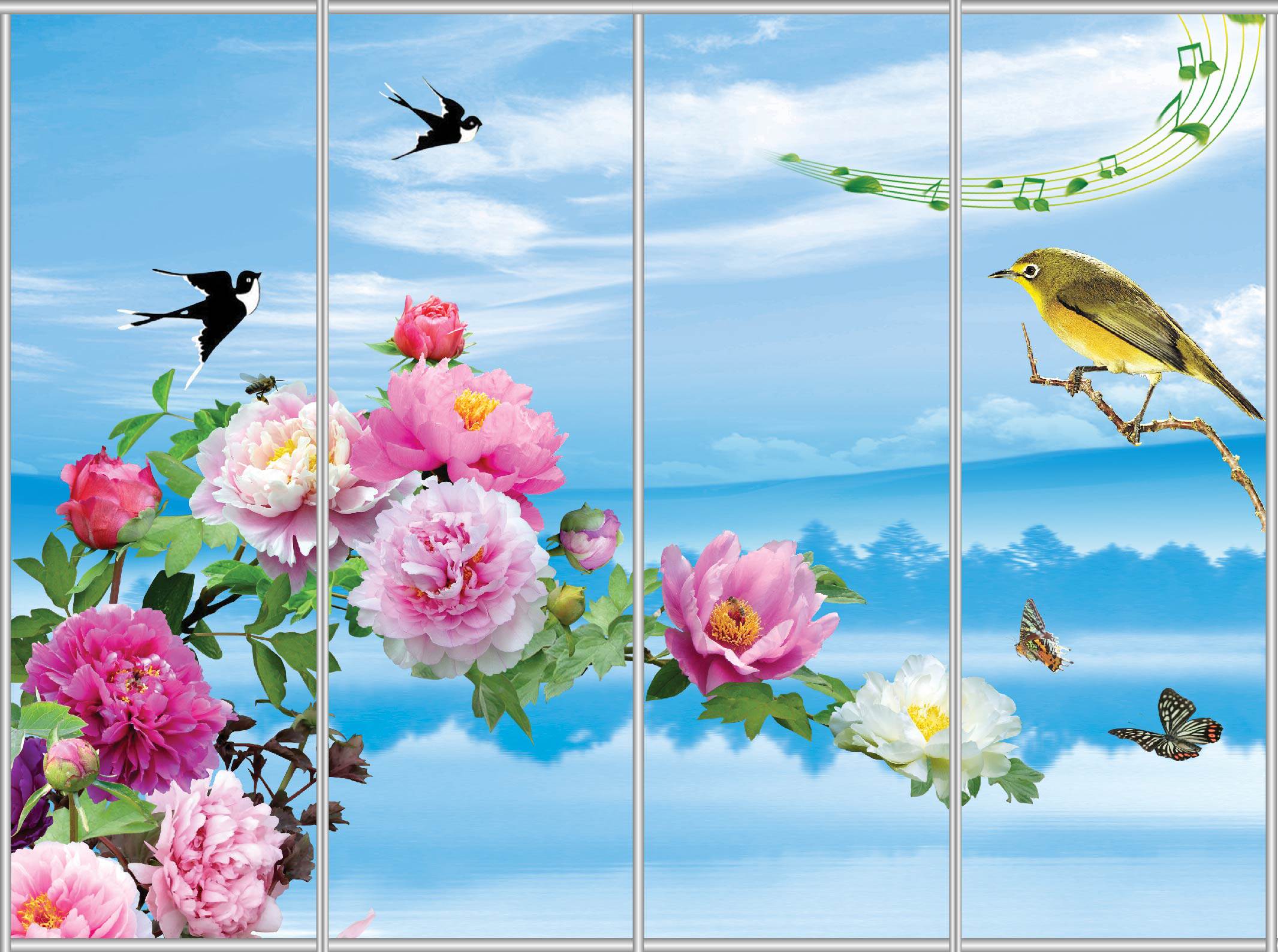 MS牡丹喜鹊移门贴纸