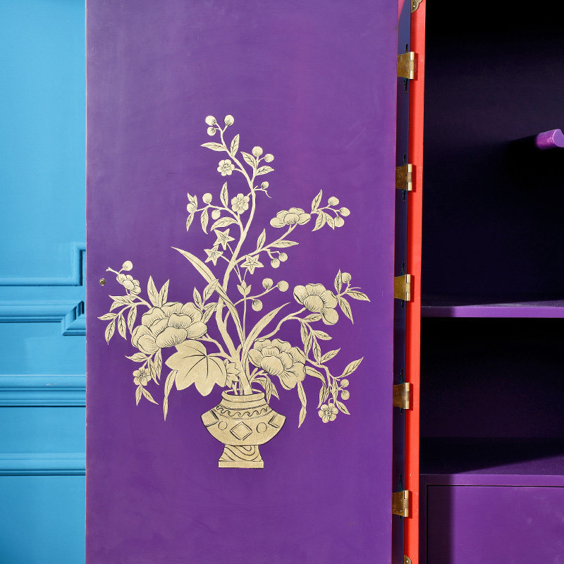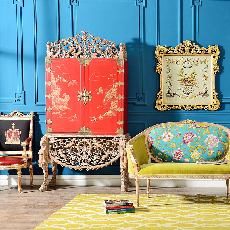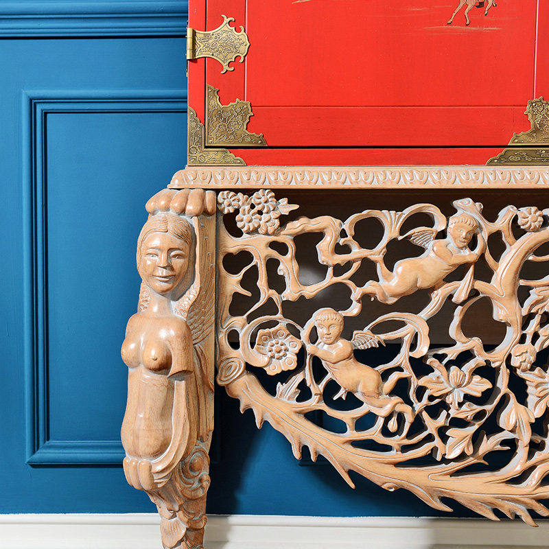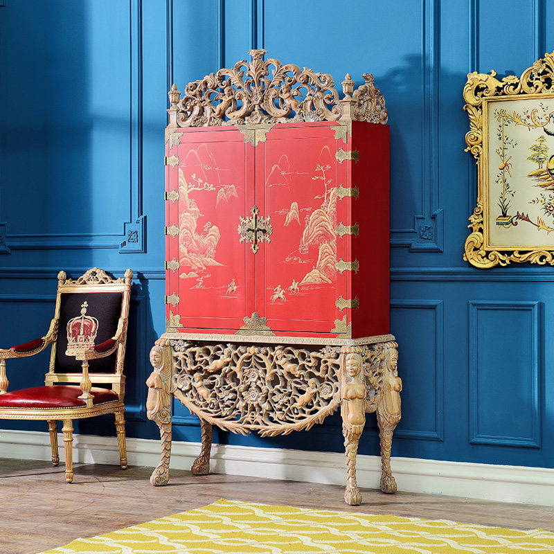 奇居良品法式白榉木红色手工雕花书柜 JJ510