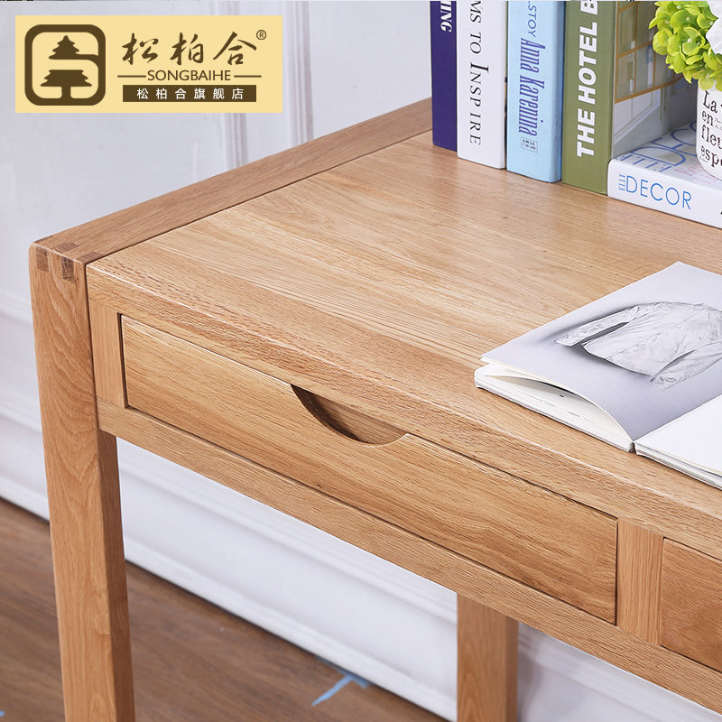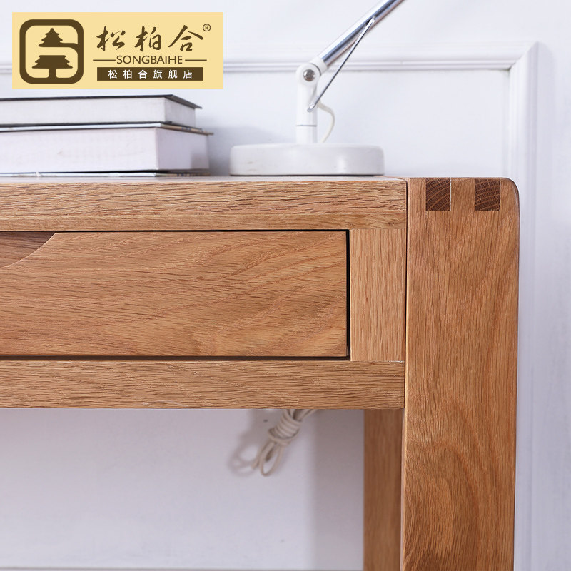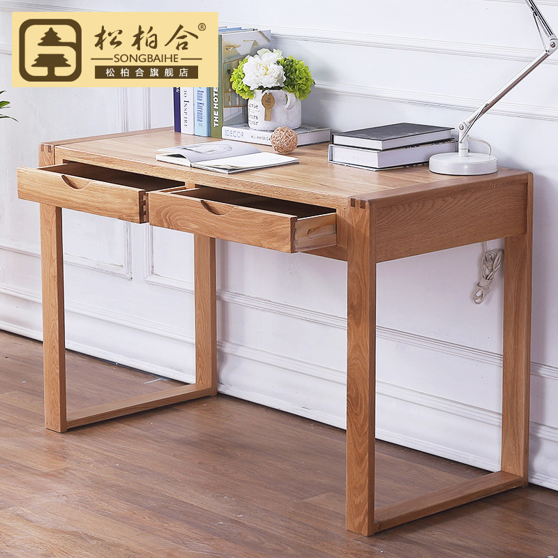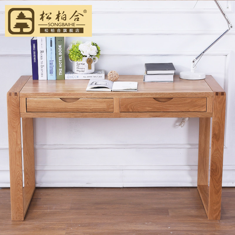 松柏合全实木书桌橡木学习桌原木色白橡双抽书桌