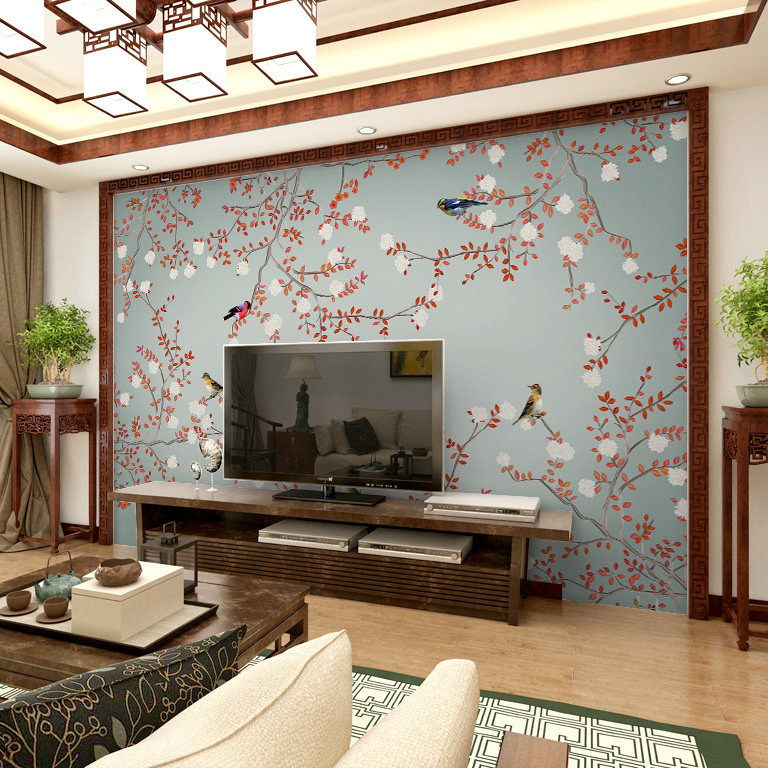 塞丽雅3d立体墙纸壁画黑桃k手绘花鸟