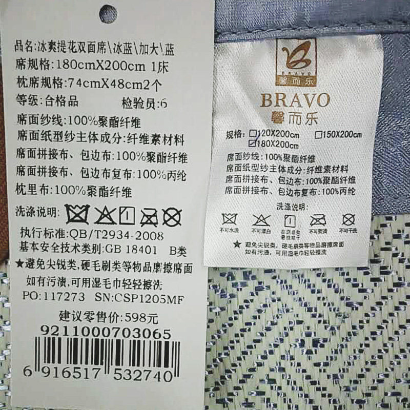 钱皇正品 碳化竹席三件套