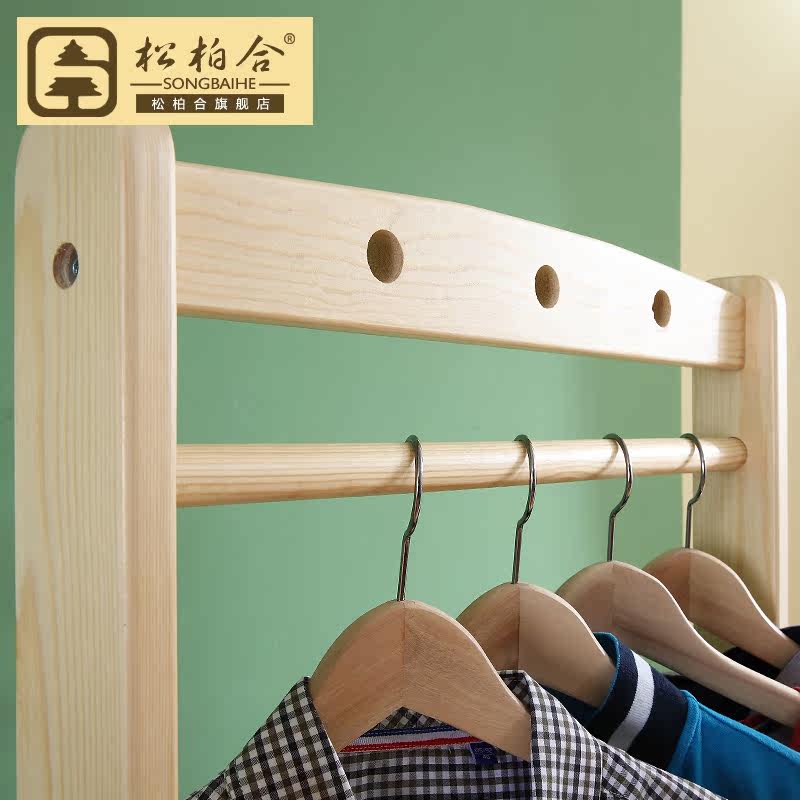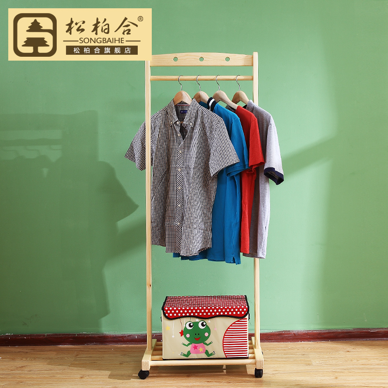 松柏合实木带滑轮可移动松木北欧田园衣服架欧陆风