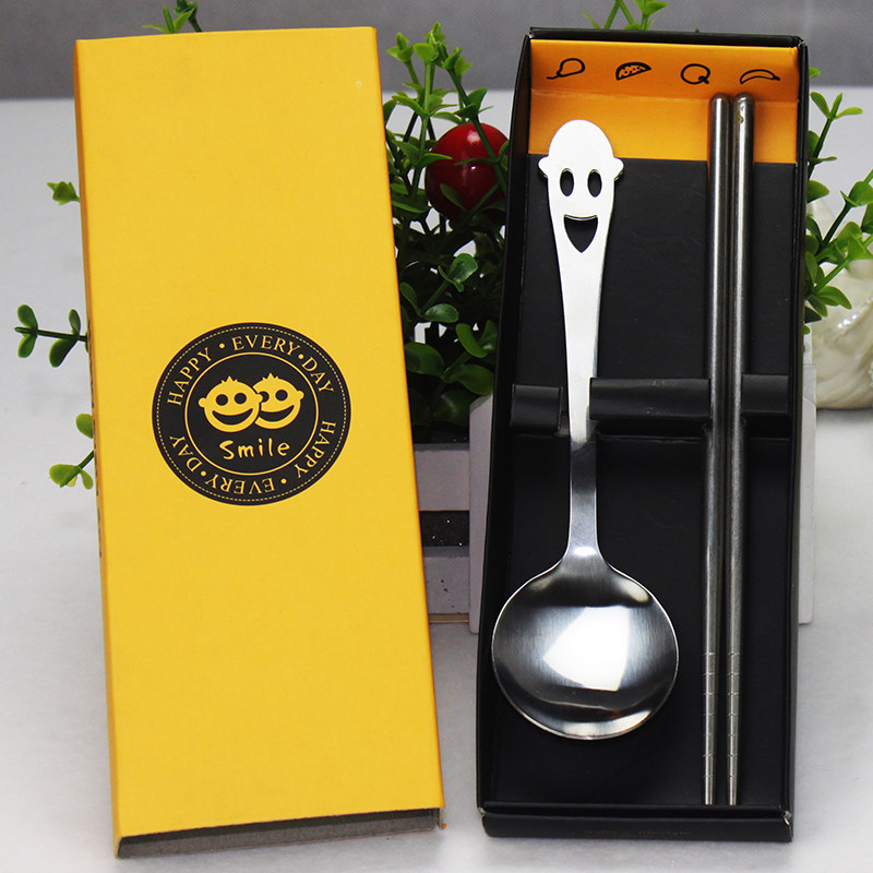 越然韩版大圆勺子筷子不锈钢笑脸餐具