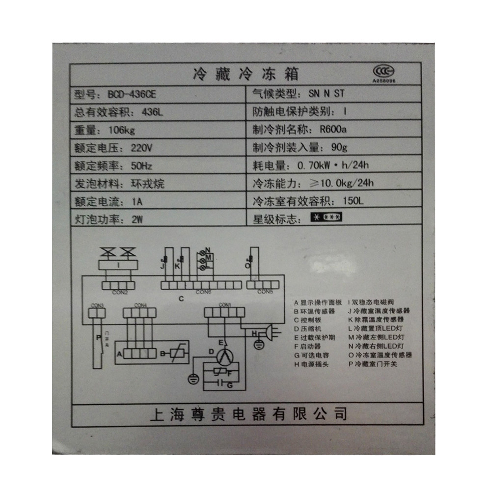 尊贵家用对开门四门铜管电冰箱bcd436ce