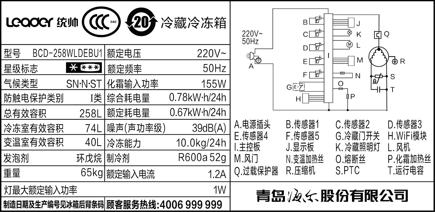 海尔leader/统帅家用电冰箱bcd258wldebu1