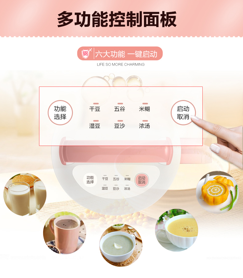 材质选用的是七叶劲钢刀,强劲粉碎食材,保证丝滑口感。高速马达电机研磨,效率十分出众,并且还有过滤网,过滤不良食材残渣,给予健康饮食体验。底盘采用循环加热功能,操作简单方便,多功能按钮清晰明了。特别设置自动洗按钮,自动清洗能力出色,给予消费者更多便利。复古外观设计,350ML容量,自带8大菜单以及8小时预约功能,晚上睡觉前放入食材,早上一早醒来即可享受美味早餐。睡过头也没关系,自带保温功能,双层防烫设计,开盖断电功能,外加一键清洗功能,给予消费者极大便利和安全性。