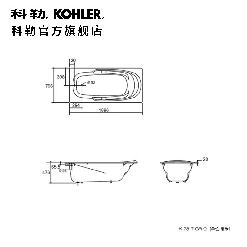 科勒嵌入式铸铁浴缸K-731T-NR/GR-0