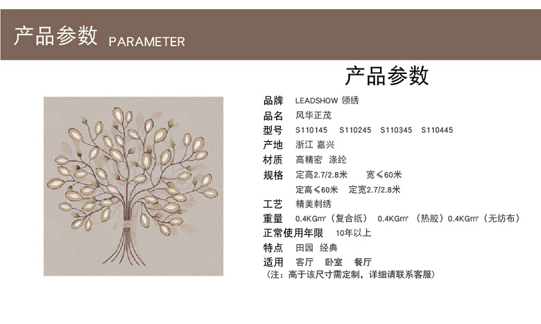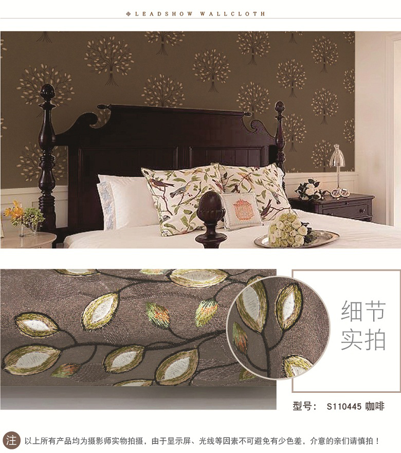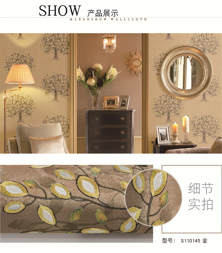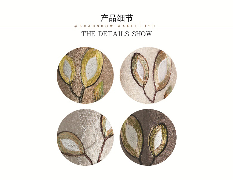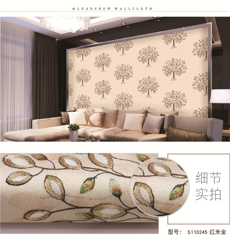 领绣刺绣墙布还是不错的,是高档涤纶布进行电脑刺绣,然后整张的绣花布再经过防霉温开幅定型,之后再用热熔胶和墙纸进行复合而得到一款宽幅无缝刺绣墙布,主是要无缝没有拼接,脏了而且还可以水洗,最主要是立体感相当好,手摸也舒服,整个墙面全是用丝线绣出来的,和普通纸和布完全不一样。