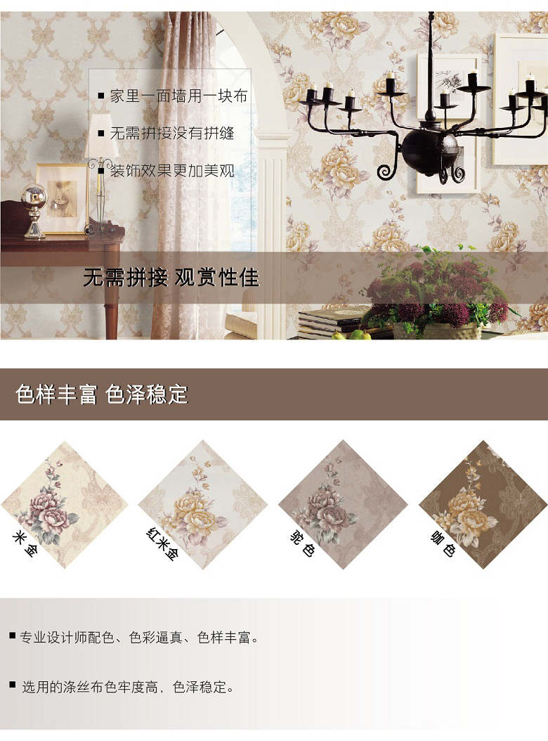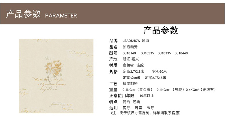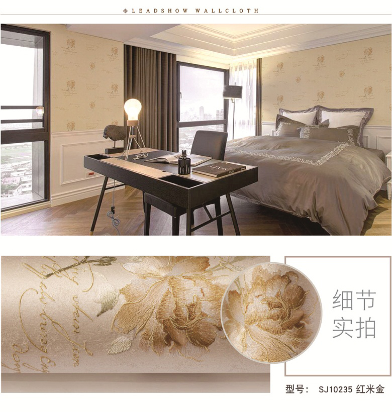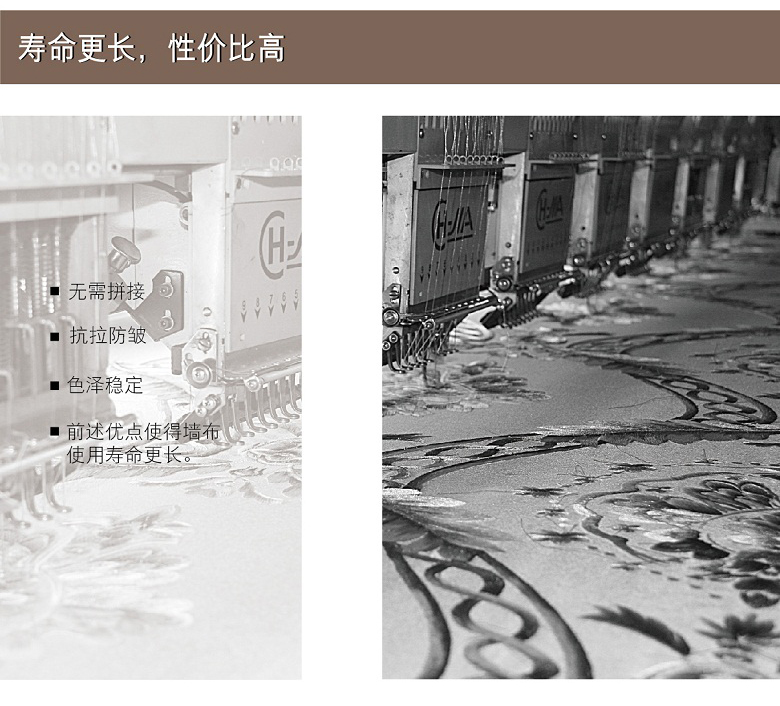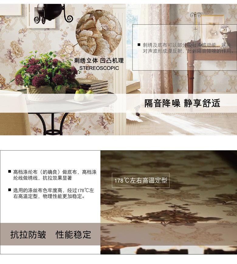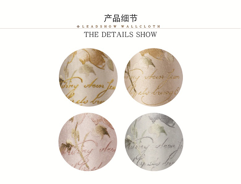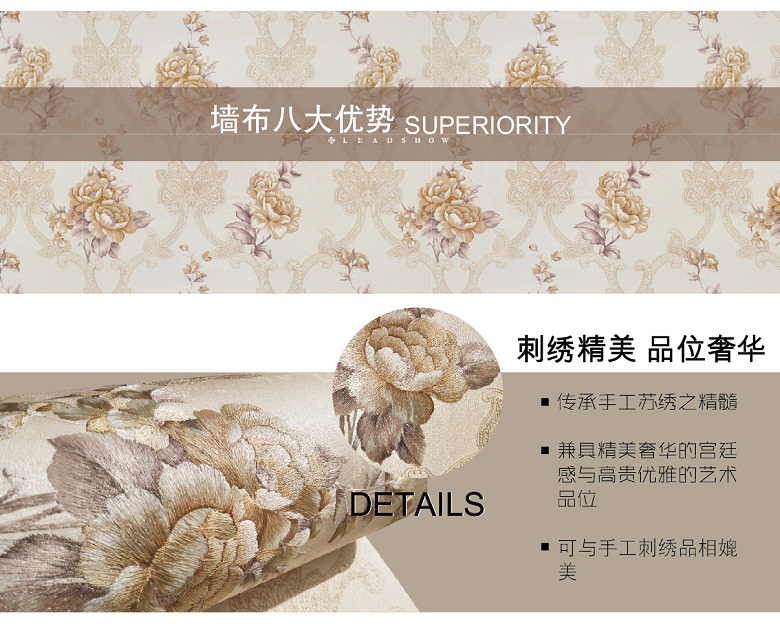 领绣刺绣无缝墙布是在一块幅宽2.7-3.2米,长60-200米的高档涤纶布上进行连续的电脑刺绣,得到的整张的绣花布再经过防水防霉高温开幅定型,得到的平整绣布再用热熔胶和墙纸原纸进行复合而得到一款宽幅无缝刺绣墙布。领绣刺绣传承了苏绣的技艺,产品本身就具备了手工刺绣精美奢华的特点。领绣刺绣墙布在图案设计上吸纳了英伦皇室的设计风格,与精美的刺绣交汇融合,更好地表现出了皇室所独具的尊贵和奢华。自然、优雅、含蓄、高贵为特点的英伦皇室风格,让东方传统刺绣的技艺更添艺术的光彩。