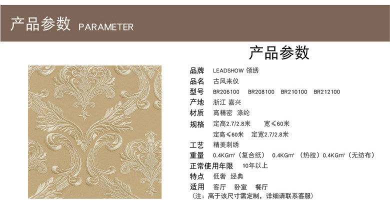 领绣墙布成立于2004年,是墙布行业的著名品牌,凭借精美绝伦的刺绣、奢华高雅的品位,受到消费喜爱,先后获得了中国绿色环保产品称号、第十五届中国(北京)国际墙纸布艺展最具品牌形象价值奖、2013—2014全国家居行业墙布十佳品牌等荣誉,通过了GB/1900 1—2008专业质量体系认证。领绣刺绣墙布表面的绣线和绣布,采用了涤纶丝材。涤纶布俗称“的确良”,是常用服装面料,具有良好的环保性能;领绣墙布中间粘合层采用EVA热熔胶,无毒无味,防水防霉,并对织物有良好的粘合性;底层采用进品原浆制作成的墙纸原纸,环保性能明显优于其它种类的墙纸原纸。产品当天施工,可当天入住。