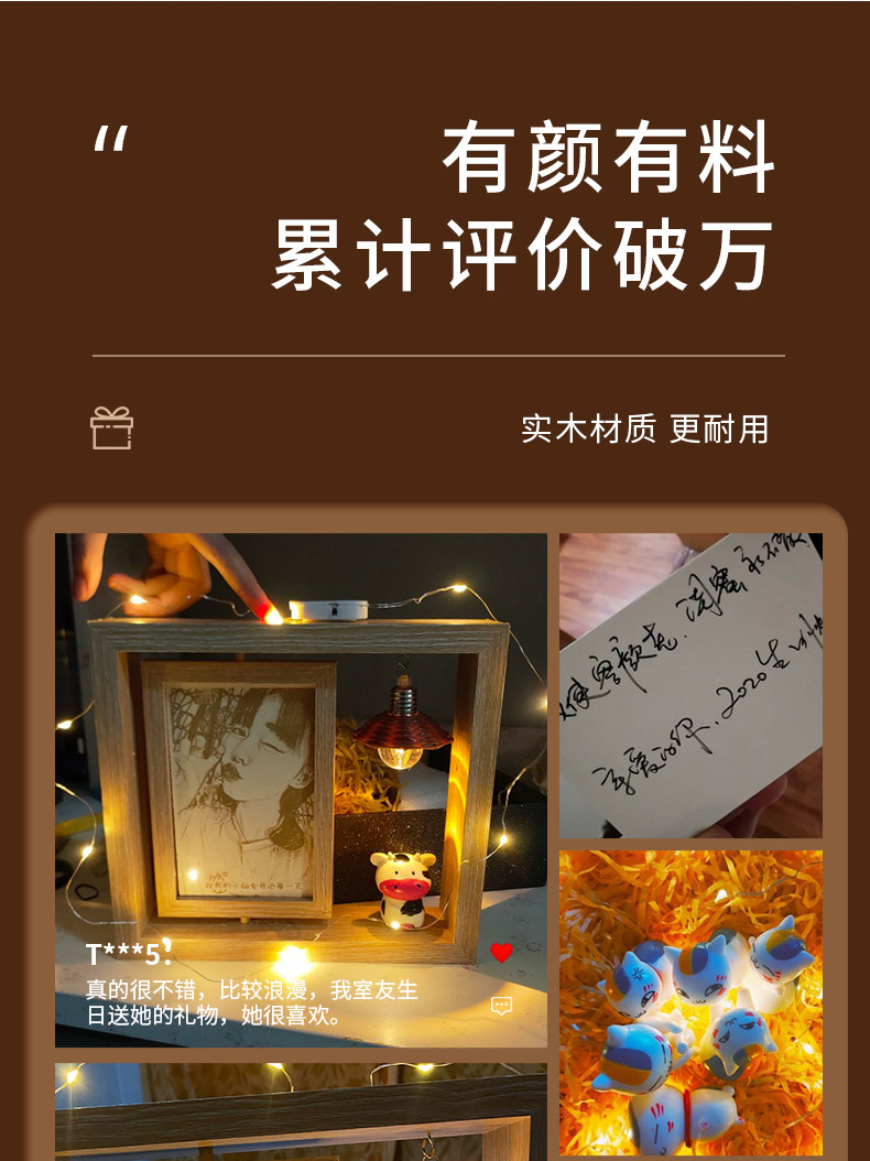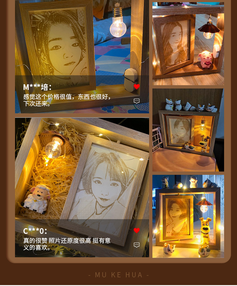 真的是很漂亮的木刻画呀,准备送给妈妈当母亲节礼物的,真的挑了很久才找到的好东西,走心又实惠。放在桌面好看又高雅,创意满满非常适合作为母亲节礼物送妈妈,整体的设计都很好,放在家里漂亮,可以作为装饰,很有纪念意义,有心意有创意,木刻画保存的很好,雕刻的照片很bi真,而且很有纪念意义,而且相框很可爱,也可以用来装饰家里,很实用,放在桌子上都是很好看的,还有可以亮的小灯,超级好看。