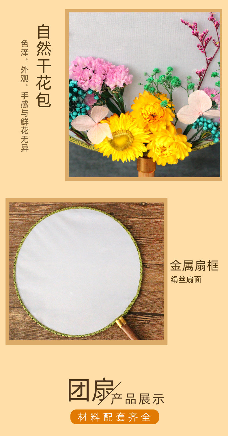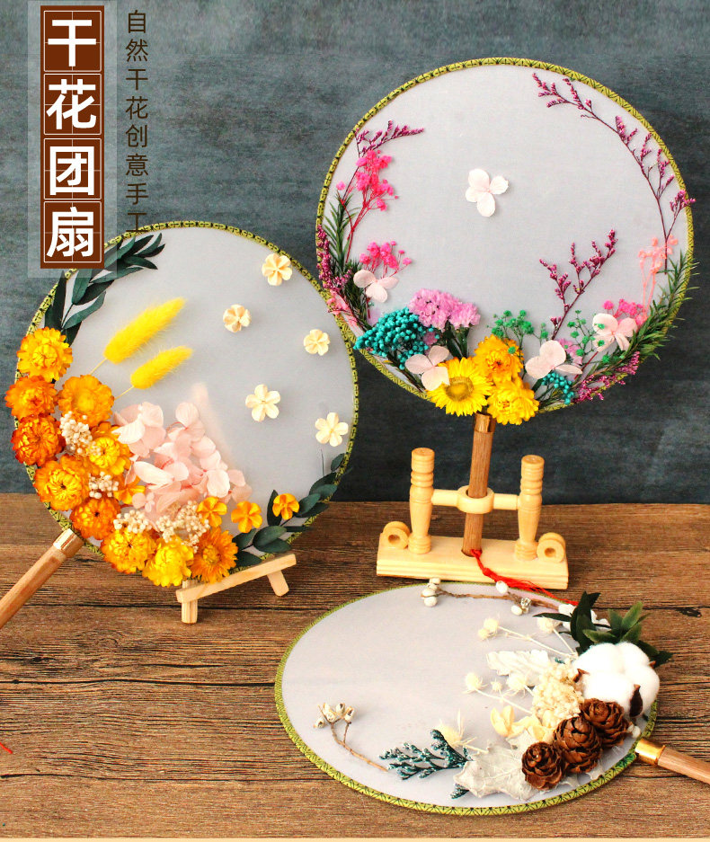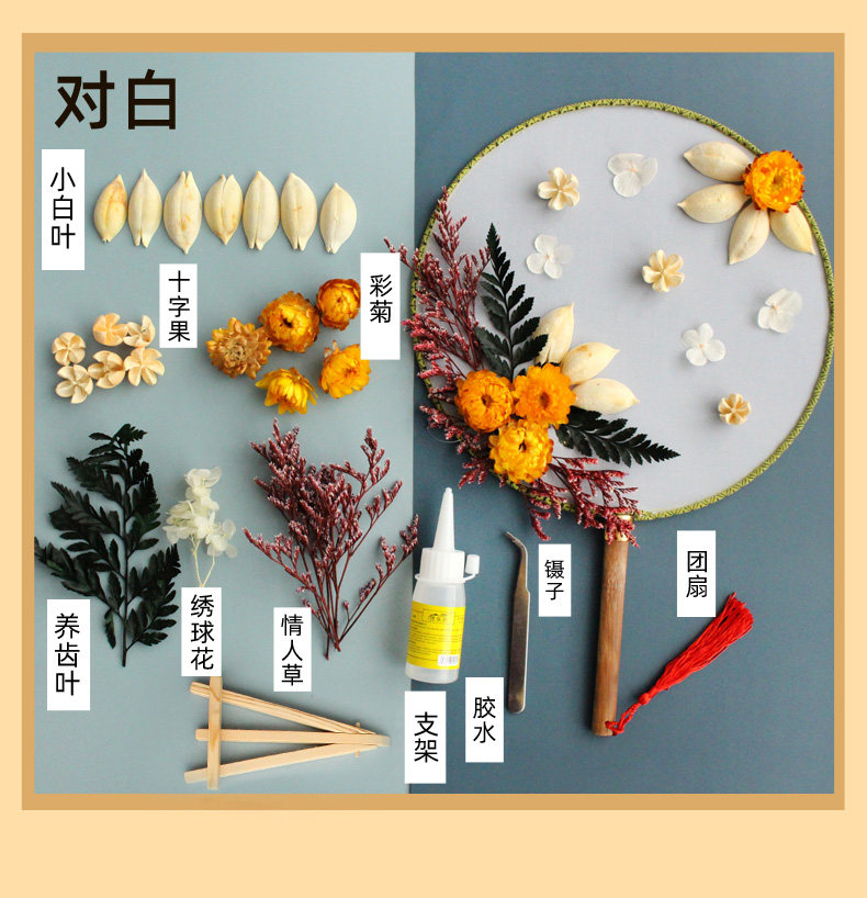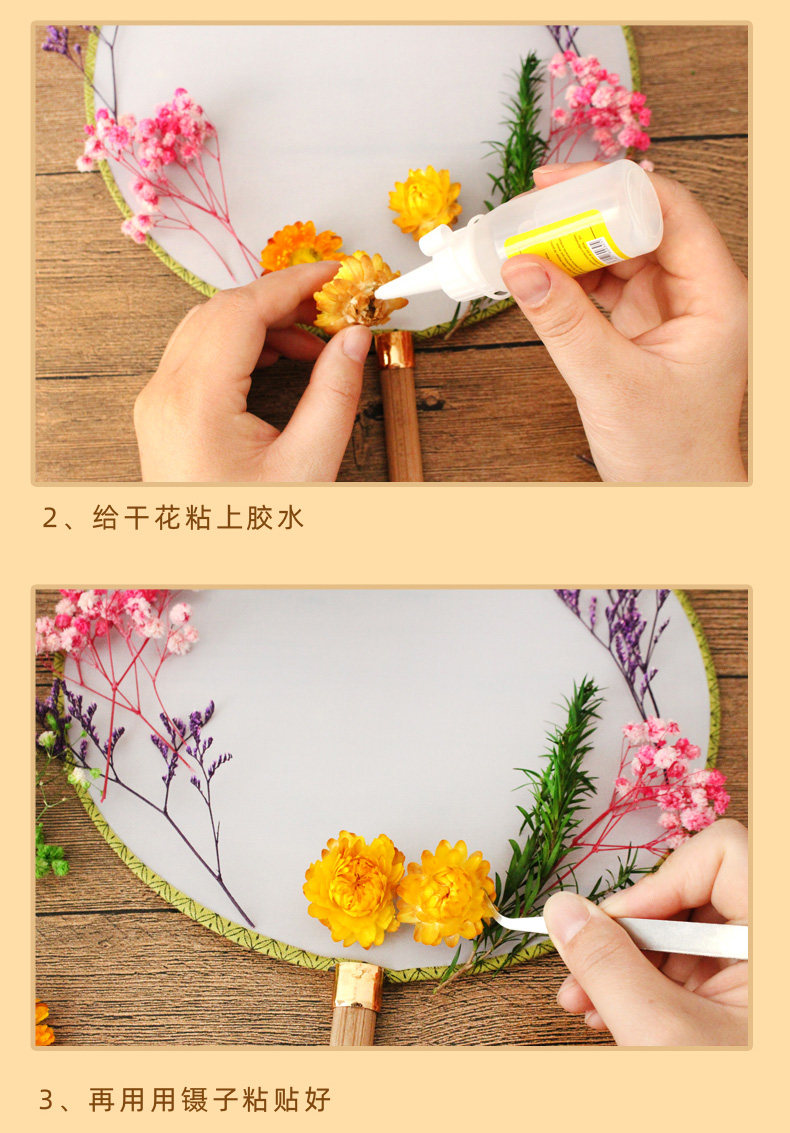 孩子自己动手粘的,一开始还担心粘不紧花会掉,干了之后挺牢固的。制作难度不是很大,和女儿一起动手完成的!有多放一些干花。没有很复杂,但粘好后效果真的不错,扇面质量蛮好的,配的干花,胶水,还有镊子,真的不错。