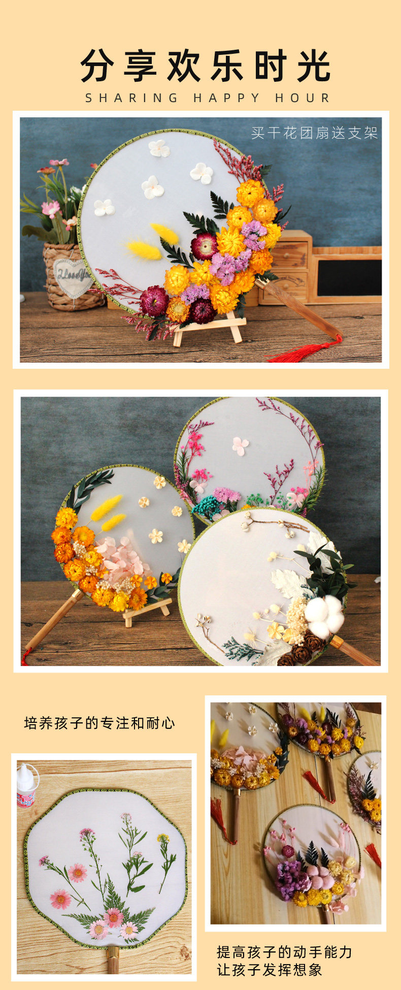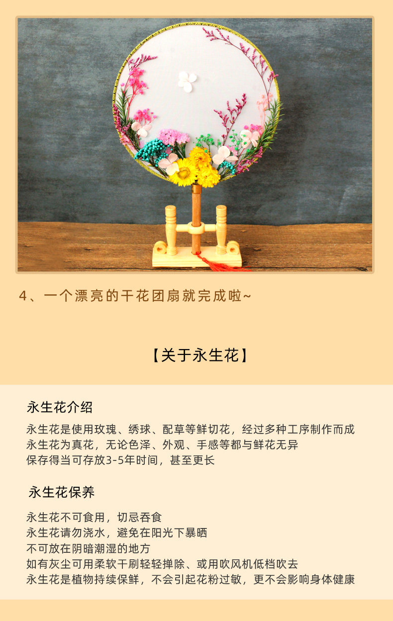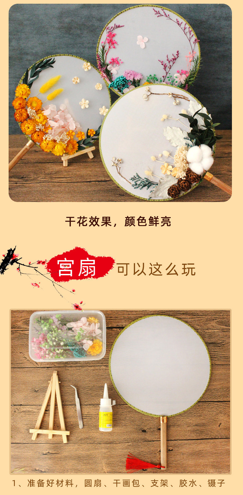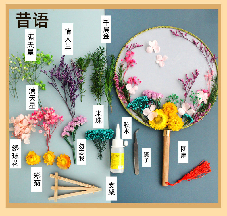 孩子自己动手粘的,一开始还担心粘不紧花会掉,干了之后挺牢固的。制作难度不是很大,和女儿一起动手完成的!有多放一些干花。没有很复杂,但粘好后效果真的不错,扇面质量蛮好的,配的干花,胶水,还有镊子,真的不错。