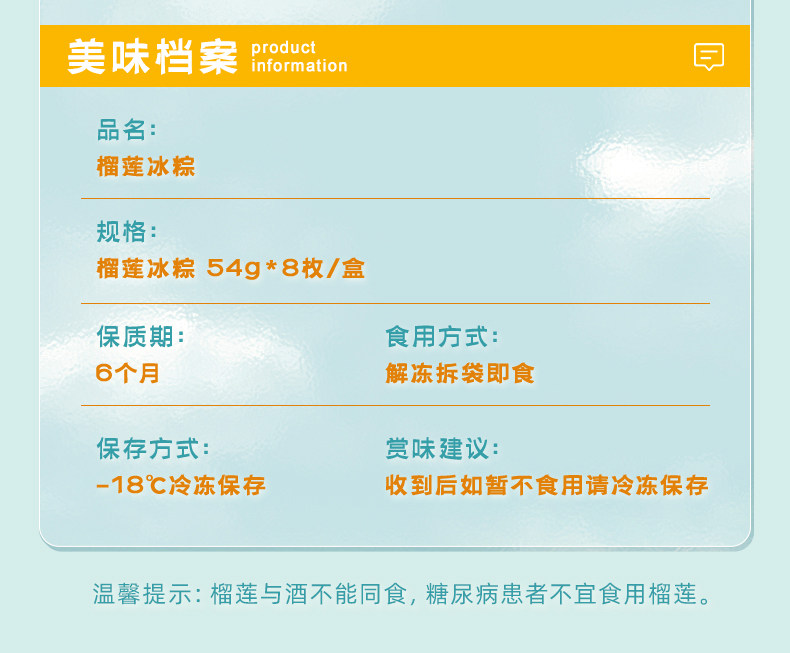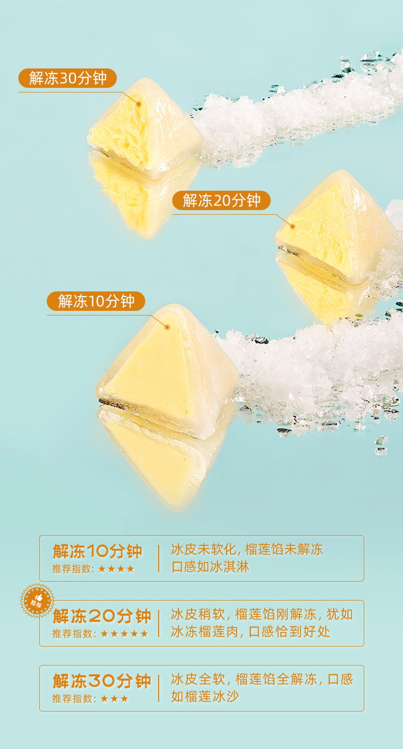 这个内馅就是纯榴莲肉,感觉什么都没有添加。真的吃起来太好吃了,冻的时候是雪糕口感,化了吃起来就是糯叽叽的感觉。包装真的没得说。外面保温袋,里面有干冰和冰袋。没有胀包,很值得信赖。里面的榴莲肉着实不错,看得出是精心制作和挑选的。百分百榴莲馅料,从拆包装开始就心情愉快。味道简直超赞,超浓的榴莲味非常好吃,爱了爱了,吃着不会腻。