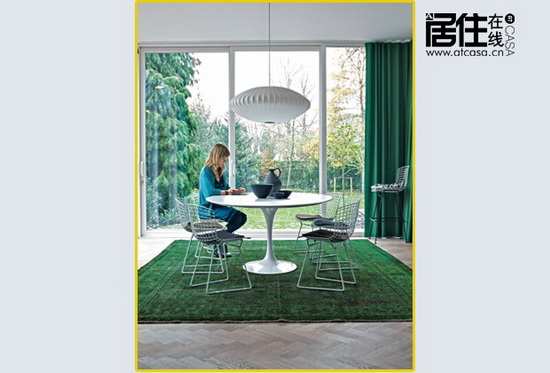 Tufty-Time沙发,由Patricia Urquiola设计,由B & B Italia出品;Bertoia Bird Chair扶手椅,由Knoll International出品;旁边,Coupé 3321落地灯,由Joe Colombo设计,由Oluce出品;AJ Floor落地灯,由Arne Jacobsen设计,由Targetti Poulsen出品。巴巴里土著部落风格地毯。