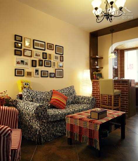 编辑点评:客厅面积不大,仅能容纳一张双人沙发,一张单人沙发,一张不茶几。喜爱文艺气息的业主采用了一系列不同色调混搭的布艺沙发,有条纹的,有图案的,连茶几也铺上一层类披肩布艺。
