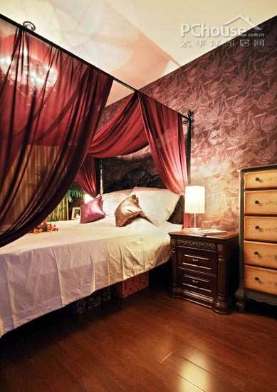编辑点评:蓝紫是卧室的主色调,壁纸是偏紫色带有图案的质感设计,床架上紫色的纱幔更加强了空间的妩媚,增添了不少浪漫情调。