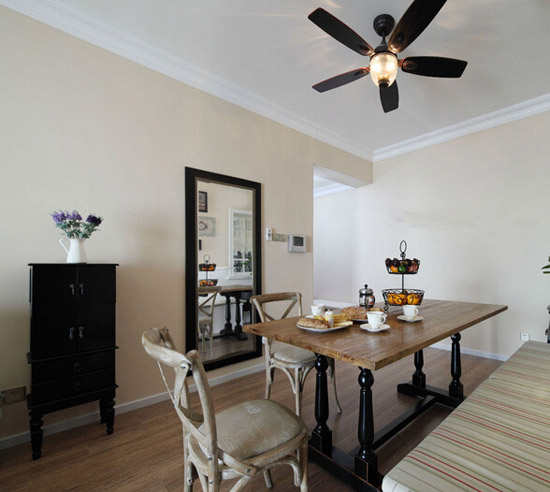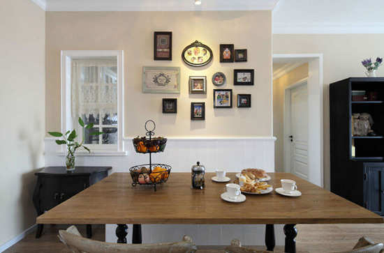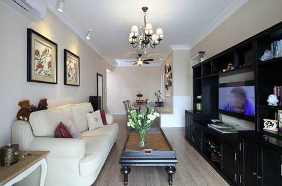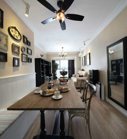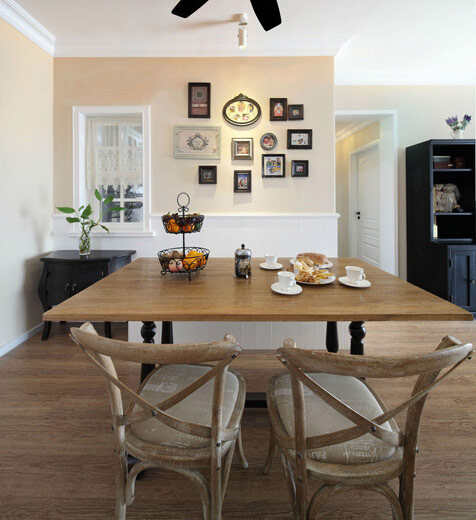 本案风格定位美式简约,原平面结构厨房位置太小,考虑厨房使用频率较高,我们把原有的生活阳台打掉,拓展厨房的使用面积,并且在厨房和餐厅位置开了一个小窗,这样看起来空间没那么呆板。在客厅的空间处理上,考虑到这套是小面积户型,客厅面积比较狭小,我们把阳台打通并入客厅,同时在原阳台的位置增设了储物柜,在小户型的设计上,储物空间非常重要。