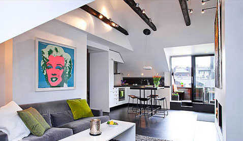 大都会风格线条简单利落,呈现出工业设计的前卫感。纽约都会风格代表了一种摩登的生活方式。本案的阁楼客厅,本案中玛丽莲梦露的背景墙挂画奠定了该客厅美式风格的基调。开放式的客厅与餐厅是原本狭小的空间变得通畅。