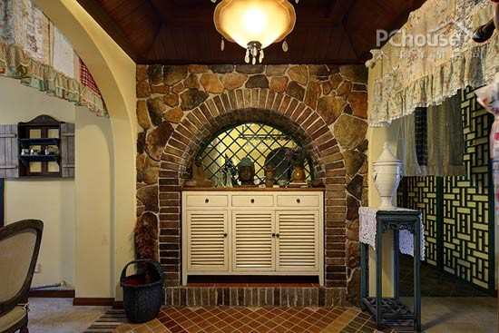 小编点评:进门即见门厅展示墙,采用大块的裸石堆砌。中间挖空的拱形门,用整齐的长条形石材围起,后方镂空的绿色菱形隔断,可望至休闲区,视觉无限延伸。中部白色的收纳柜有美式乡村的韵致,地面使用深褐色菱形拼砖,与墙面相衬托。