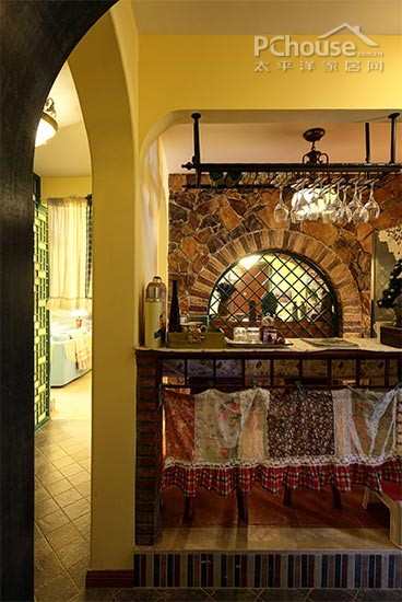 小编点评:此休闲区位于厨房与走廊之间,后可望玄关,左可通往走廊,右可过渡至厨房。可谓是“条条大路通厨房”。省却吧台的挑选,设计师使用了深色的砖砌出休闲吧台,昏暗的灯光下,倒挂的酒杯泛着休闲的魅影。