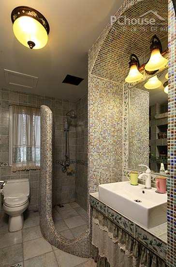 小编点评:马赛克已被认为是古旧而无特色的建筑用材,但经设计师的巧手运用,亦可散发出独特的复古韵味。此处,设计师利用马赛克堆砌了干湿区的隔断,流水线造型的隔断,既把湿区水气隔绝,又不至于让湿区过于昏暗。沿袭公共空间的拱门元素,卫浴镜也用混色马赛克打造了拱形镜框。