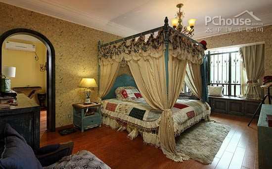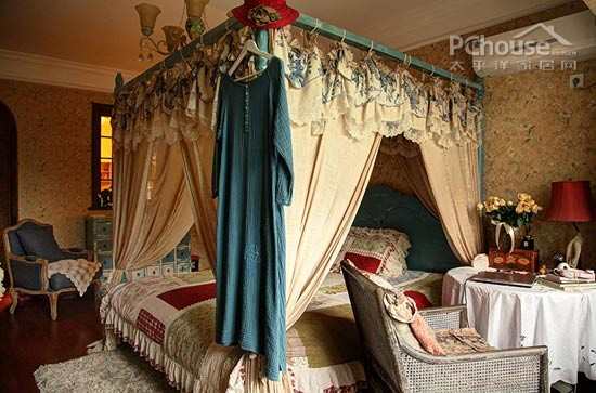小编点评:欧美乡村风格颇流行用帷幔打造仿宫廷气质的卧室,此处,设计师用泛旧的木质搭建床架,并配上米黄色的布幔,色调简约而不过于华丽,紧紧跟着乡村风格的主调。全室的柜子色调也是与床架配套的泛旧湖绿色,质朴的意味继续蔓延。