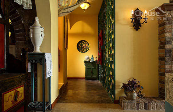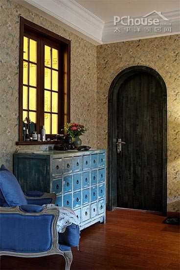 小编点评:乡村风格不论中外,此原则在走廊处展现无遗。深绿色高脚桌上带有些许中式雕饰花纹。往走廊尽头看去,镂空的圆形端景,与下方的深绿色边柜相呼应。走廊侧旁到顶的一整面镂空花纹雕饰,中式意味极浓。