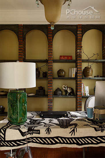 小编点评:书房配备书桌,书桌后方是满满一整墙的收藏展示品。利用裸砖分隔,再配以古色古香的展品,品读出女主人的独特经历。