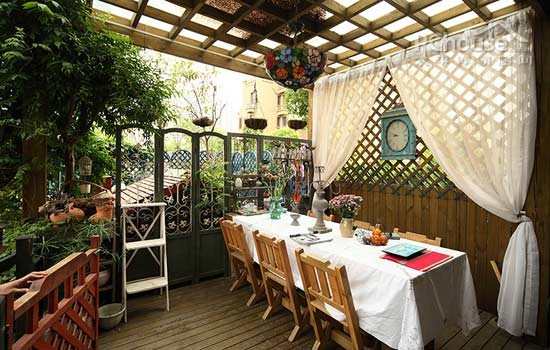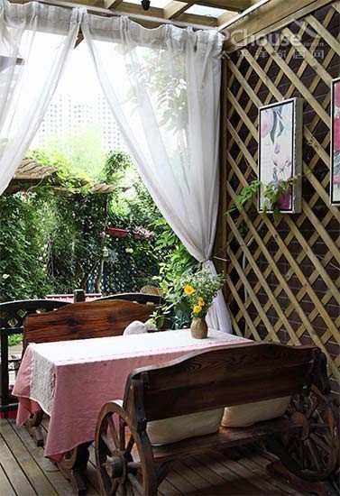 小编点评:钟爱古旧木材的女业主,在阳台全铺设了木质地板,甚至阳台的护栏都是木质的。通过智能设计的顶部,既能防水,又能让阳光直射。此处还设计了长形的餐桌,餐桌背后的透明丝质布幔,似是拉开一个休闲的午后时光,女主人喜欢于此处与三五知己品味下午茶。