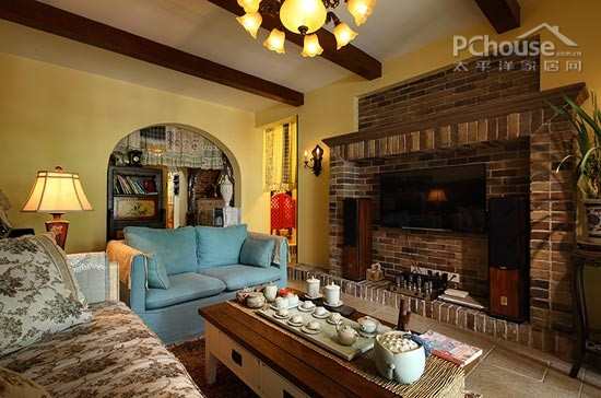 小编点评:客厅电视墙呼应玄关设计,继续使用裸砖墙拼砌出朴素风格的墙面,并打造类壁炉式造型,把电视音响等器材收纳整齐。木质人造横梁和茶几是是美式乡村风格元素,碎花布艺沙发则是欧式乡村风格元素,混搭手法可见一斑。