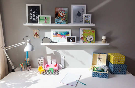 编辑点评:小小书桌台,没有收纳柜也没关系,有墙壁收纳板来帮你搞定。两条收纳板也可以收纳很多东西呢!