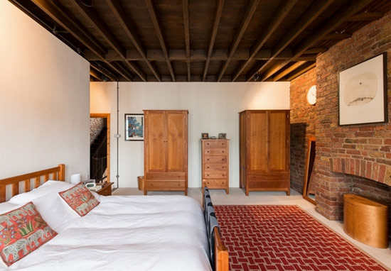 编辑点评:卧室保留原始的砖墙与木条装饰,显得格外有老旧的年代感,挑高空间搭配大片的落地采光,阳光大剌剌洒在每个角落,明亮的空间看起来更开阔。
