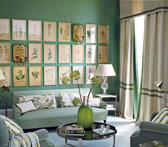 小编的话:各种植物主题的画幅有序的在绿色墙面上排列开来,可见房间主人也许是个热爱植物的人,客厅的整个主题色选用了带有环保感的绿色系,不管是墙面还是家具,都以深浅不一的绿色来诠释。客厅里因为拥有这样一片绿,即使空间不大总会有人喜欢上这样一款客厅的。