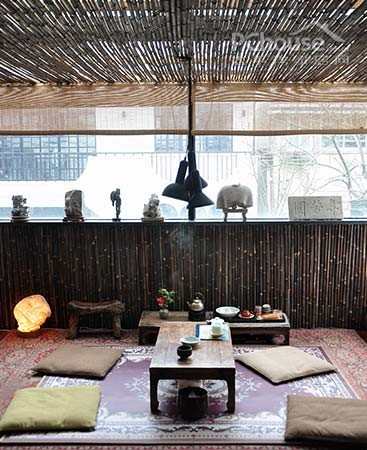 茶室天花板仅以玻璃隔断,紧贴着玻璃的是一层竹竿铺设的“幕帘”,日月之光可自竹竿间的缝隙洒落,影影绰绰,宋人苏舜钦描写的“月光穿竹翠玲珑”应该就类似于这般景象。