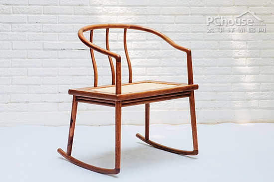 摇椅通体光素无雕饰,灵感自传统圈椅经典形制,加以现代设计手法洗练重塑,不争不扬。无论是厅堂雅集,还是书斋小隐,皆能摆放自如。椅圈以楔钉榫三接而成,圆中带扁,靠背板则依背部曲线,诗意简化为梳背S型,扶手不出头而与鹅脖相接,略去联帮棍,与椅盘下腿足一木连做,椅盘座面造软屉,皆为手工编藤绷棕,下施平直横枨,不安牙子,侧脚显著,翕张自如,曲木轻摇处,自有浮云深处的闲逸感受。