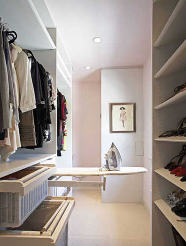 衣物变多,无论怎么收纳都会受到挤压,特别是对于那些折叠收纳的薄型衣物,为了穿着的平整靓丽,上身前用熨斗烫熨下则十分必要,利用抽屉原理,将烫熨的工作台做成小机关自由伸缩,是几平米大的衣帽间中最贴心的设计。