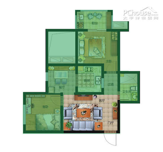 设计解读:主卧室没有进行过多的空间设计,为响应业主需求,把阳台变身成为阳光小书房,由拱形门洞相连相通,十分别致。