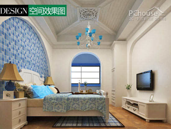 设计解读:拱门元素应用于电视墙、阳台,严格遵循了地中海风格的细节设计。白色家具带有欧式线条,与吊顶的线条相呼应,空间视觉立体感极强。