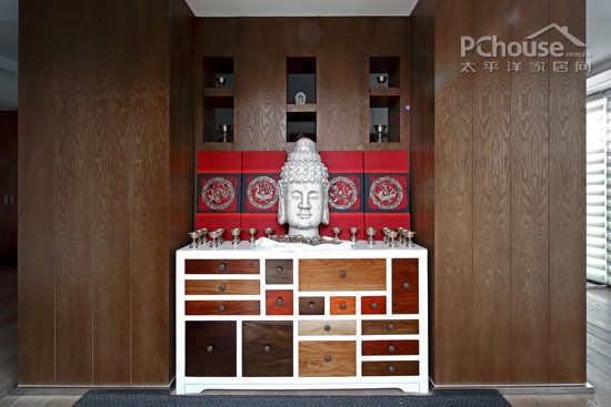 编辑点评:典雅的玄关,具有强大的收纳功能,但却处处彰显设计心思。别致的佛头饰品搭配凸显异域风情,色彩却与空间很巧妙的结合,并不觉突兀,一瞬间仿佛让人穿越时空。可谓是简洁不简单。