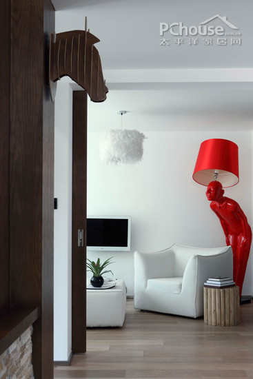 编辑点评:白色的空间里加入红色的人形落地灯,一不小心像是来到了798的广场上。让这一空间立时变得好玩儿了起来,业主的居于淡雅,跳脱平淡的性格一下子彰显了出来。