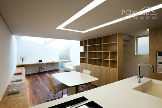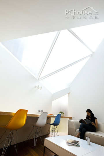 设计解说:这房子选址东京临近青山的住宅区,一个多边形的地段。设计团队意识到在这个城市里,天窗最能通风透气,也是人与大自然之间的重要联系。因此决定将客厅、饭厅和厨房布置于大型天窗下,把一片天空带进屋内,让屋主有一个明亮的家。