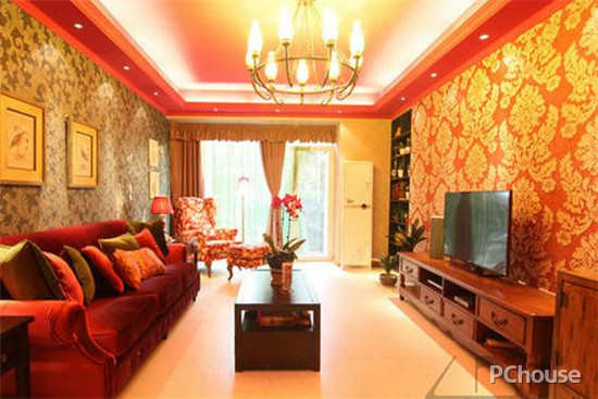 这款客厅给人的第一感觉就是金壁辉煌的高贵感。整个客厅的壁纸在灯光的映照下,反射出耀眼的光芒。配上线条简约的电视柜与茶几,布艺的沙发柔软舒适,茶几上的一盆蝴蝶兰,在不经意间提升了整个家的品质,将东南亚奢华舒适的风格诠释的非常透彻。