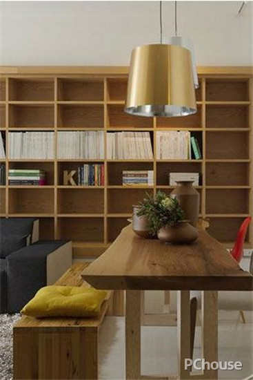 木质的餐桌椅线条流畅,和客厅的书架形成很和谐的美,地板下收纳让电视下方以设计感格栅隐藏视听设备,作为主卧房的和室则具有衣柜、内嵌化妆台、地板下收纳等全面式的弹性机能。
