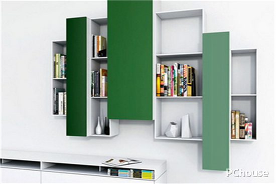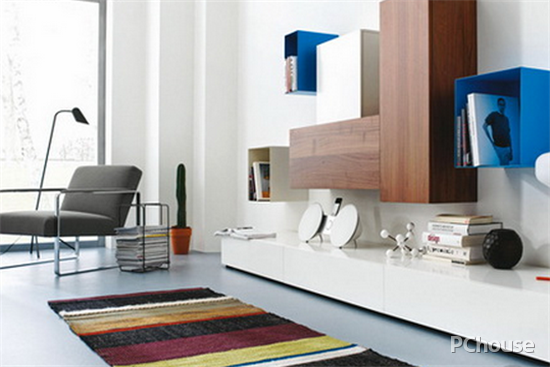 高光白色烤漆和胡桃木纹是保守且安全的色系组合,如果你不安于平淡和规矩,可以加入高饱和度的蓝色金属质地挂墙单元,房间布置瞬间被减龄。