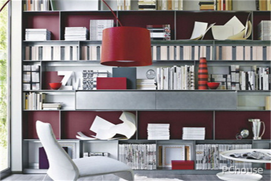 上下区域局部使用了暗红色的组合柜背板,使这个体积庞大的书柜看起来不再沉闷压抑。红色也因此成为房间色彩的呼应暗号,落地灯的配合相当到位。