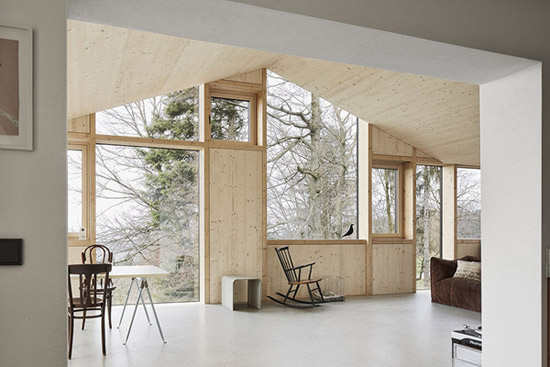 编辑点评:向外延伸出去的木框结构,在这里形成了一个名副其实的观景台,可开与不可开的透明窗户组合,让室内采光与通风两相宜。