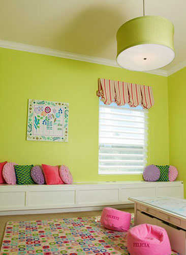 一进房间,首先被靓丽的浅绿色墙漆所吸引,整个空间用色甜美靓丽,而飘窗边上被改造成了一长排收纳与休息兼具的长椅,上方放上各式颜色的柔软靠包,飘窗本身也作了美丽装饰,百叶设计与条纹窗旗让飘窗与众不同。