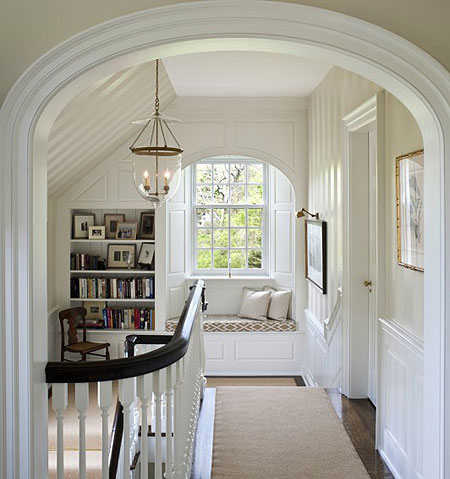 楼梯转角处也常常有这样一个小窗体,透过窗体往往有十分美丽的风景,而这个区域其实有着较为宽敞的空间,必须好好利用一番,这个案例,紧贴窗边被设计成了舒适的沙发座椅,而一侧的墙体被设计成了书架,也是一个很好的阅读区。
