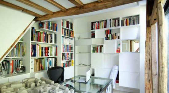 编辑点评:随着楼梯的设计,书房在楼梯下面的格挡空间也被设计成了书架区。对空间的大幅度利用,除了节省空间以外,还能够调节频繁的垂直线条与矩形空间。使其不那么单一。